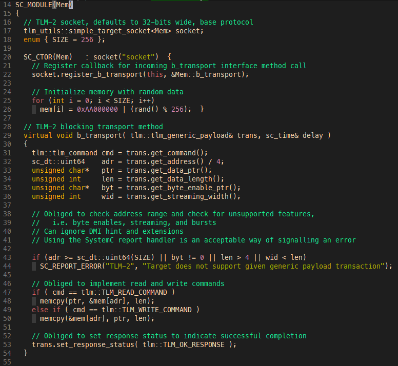 이 때 slave에서 선언한 함수(b_transport)를 사용합니다.(30, 29)